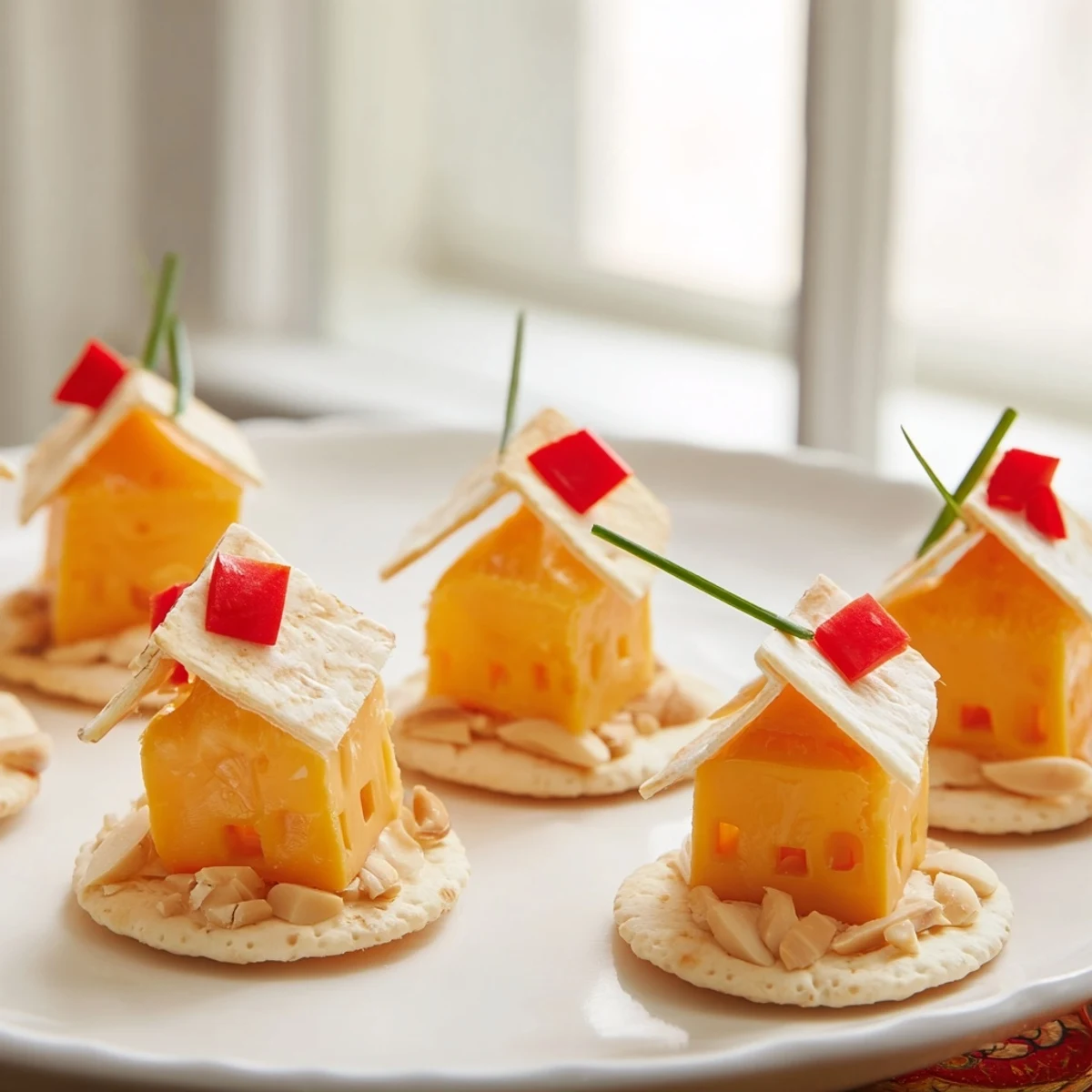 - Arrange two almond slices on each cheese cube in a peaked formation, slightly overlapping them at the center. This overlap is the secret to making them look like actual pitched roofs instead of random slices.