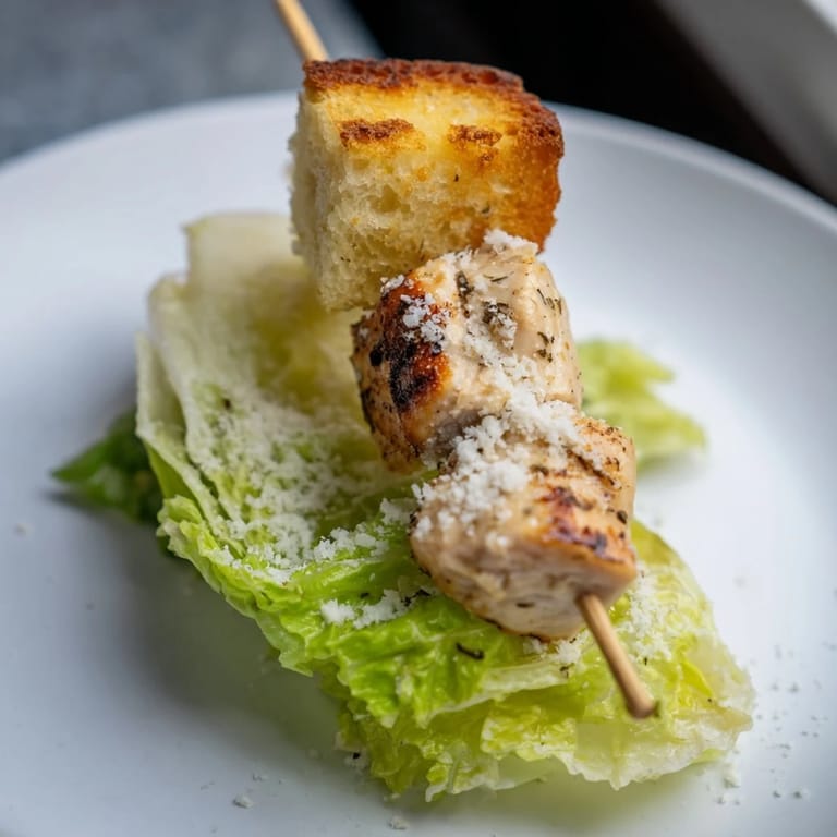 Save to Pinterest I threw these together one afternoon when friends texted they were stopping by in an hour. I had leftover chicken breasts and a bag of romaine that needed using, and suddenly remembered those fancy restaurant skewers I always admired but never ordered. Turns out, threading a salad onto a stick is ridiculously easy and makes everything taste better. The crunch of the crouton against the warm, garlicky chicken felt like a tiny celebration in every bite.