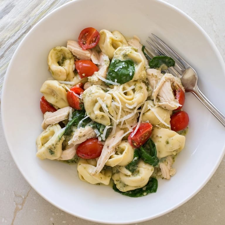 - Add the cooked tortellini and shredded chicken to the sauce, tossing gently until every piece is coated in that gorgeous green-speckled cream. Let it warm through for a minute so the flavors start mingling