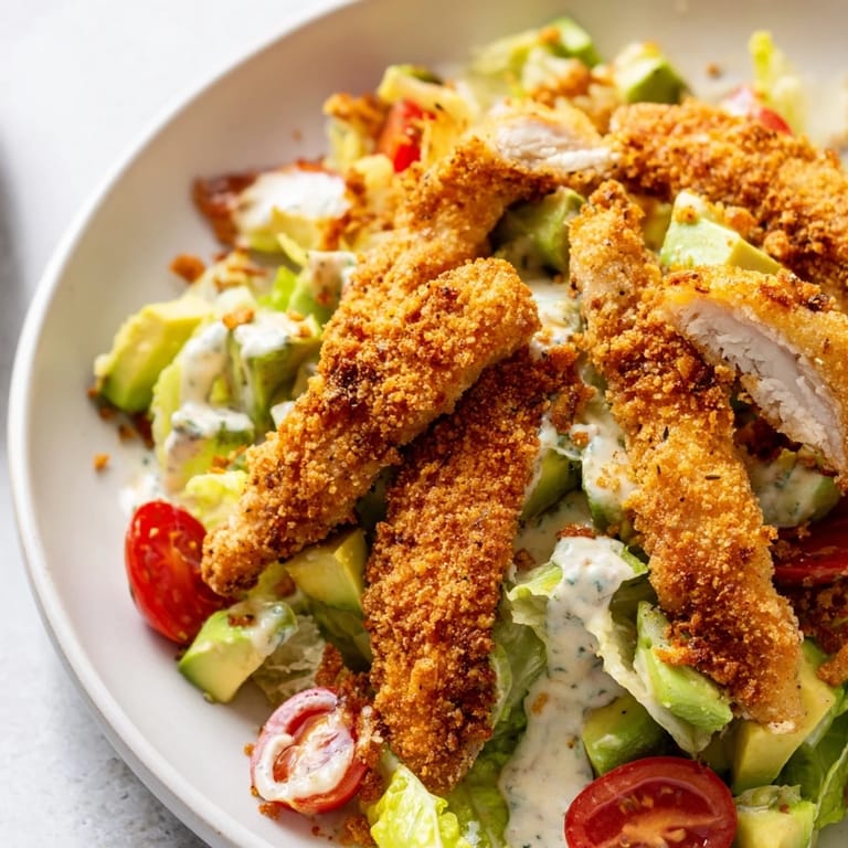 Save to Pinterest My neighbor knocked on the door one Saturday holding a bag of lettuce from her garden, and I had chicken thawing with no real plan. I wanted something hearty but not heavy, colorful enough to feel like effort without the fuss. That afternoon, I breaded chicken strips while the kids set the table, and we built this salad together, layering everything like a game. It became our go-to whenever we want dinner to feel like a celebration without leaving the house.